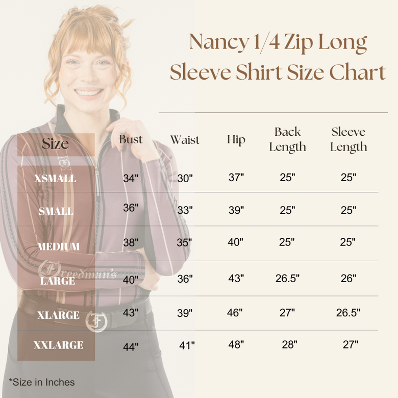 This soft moisture wicking long-sleeve shirt is equestrian fashion apparel at its finest. With a custom print designed exclusively by Freedman’s, this bold new look is just what you’ve been looking for. Wear this statement piece to ride or to the horse show. The Nancy 1/4 Zip long sleeve shirt is finished with a silver tone zipper, printed Freedman’s on the left sleeve.