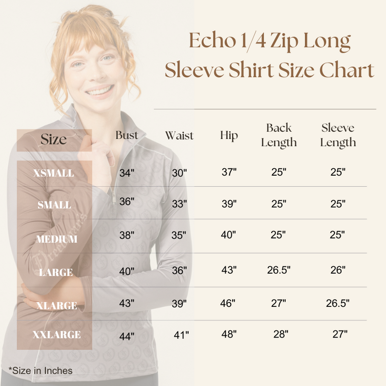 This soft moisture wicking long-sleeve shirt is equestrian fashion apparel at its finest. With a custom print designed exclusively by Freedman’s, this bold new look is just what you’ve been looking for. Wear this statement piece to ride or to the horse show. The Echo 1/4 Zip long sleeve shirt is finished with a silver tone zipper, printed Freedman’s on the left sleeve.